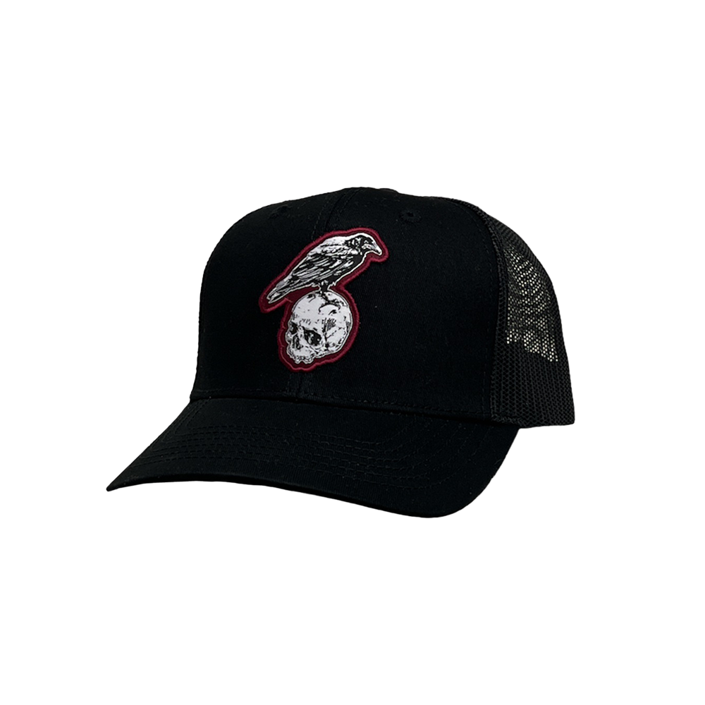 Black trucker hat featuring crow graphic on front and HARDY logo on back.