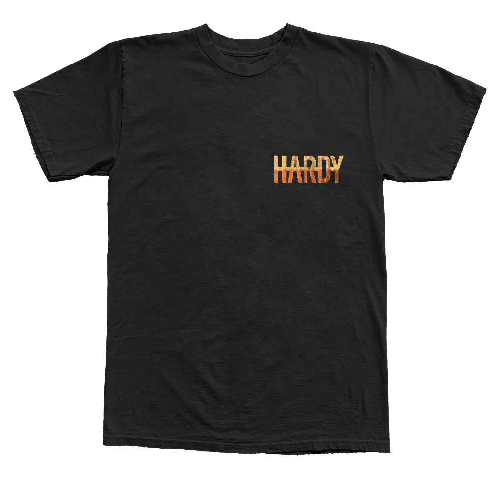 Black unisex tee with Hardy printed on the front left chest and Buck on the Wall with a deer head design printed large on the back.