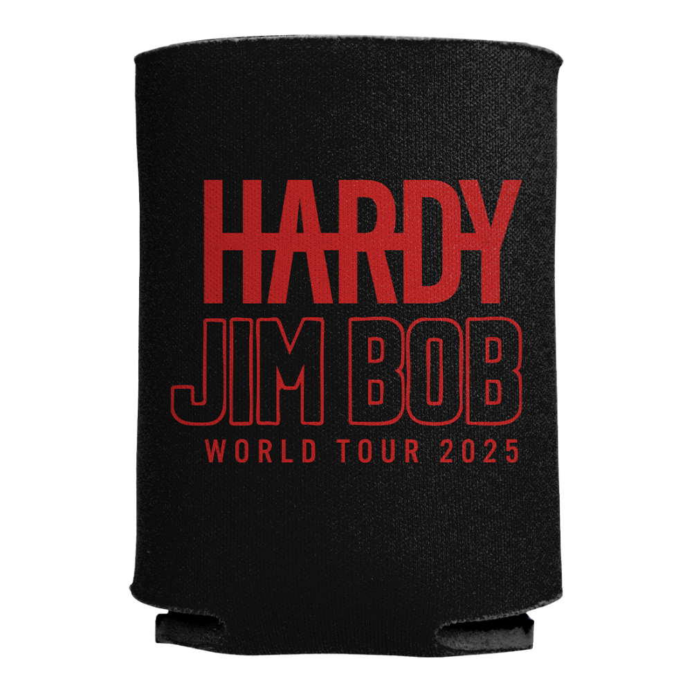 Black drink holder with HARDY Jim Bob World Tour 2025 on one side and Jim Bob photo on the other.