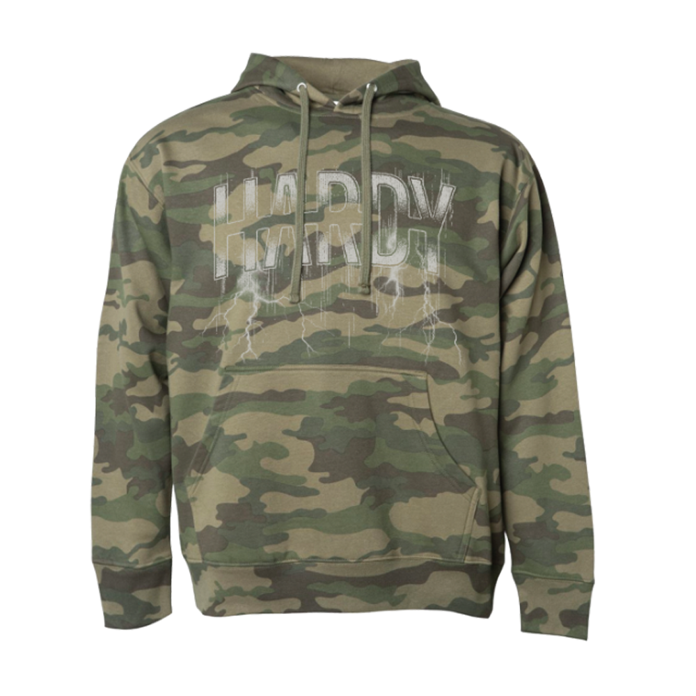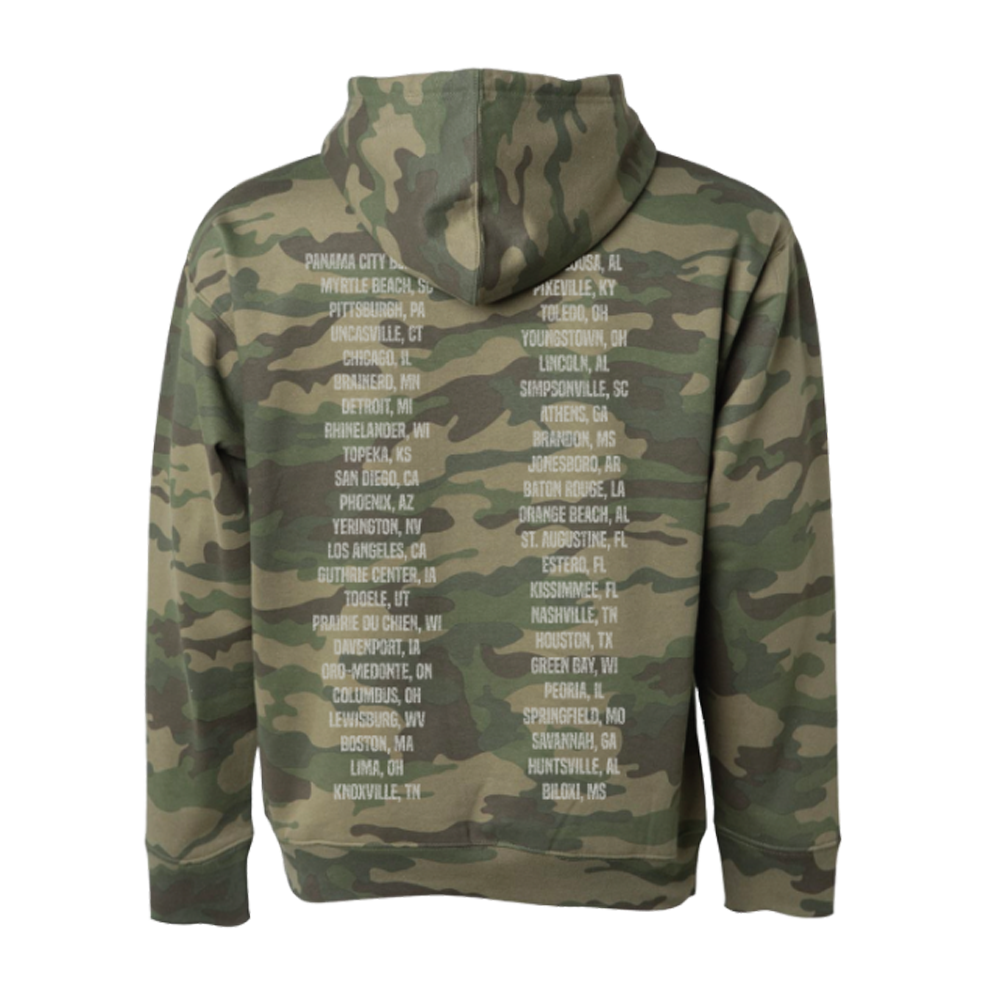 FOREST CAMO PULLOVER HOODIE WITH HARDY LIGHTNING DESIGN ON THE FRONT. 2023 TOUR CITIES LISTED ON THE BACK.