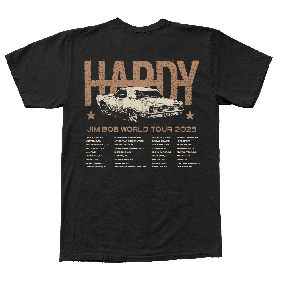 Black tee with Hardy photo printed on the front. HARDY logo on the back featuring the car from Jim Bob’s front yard and the world tour dates printed on the back.