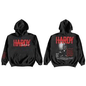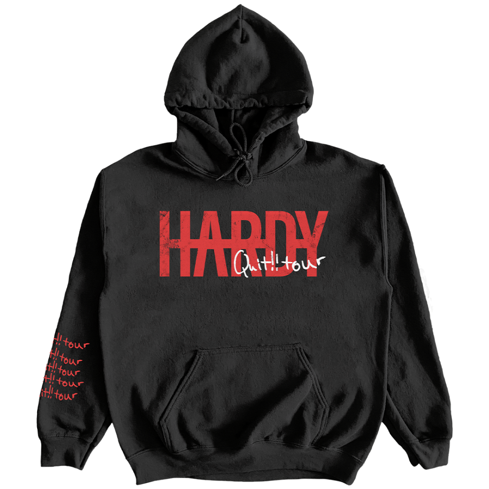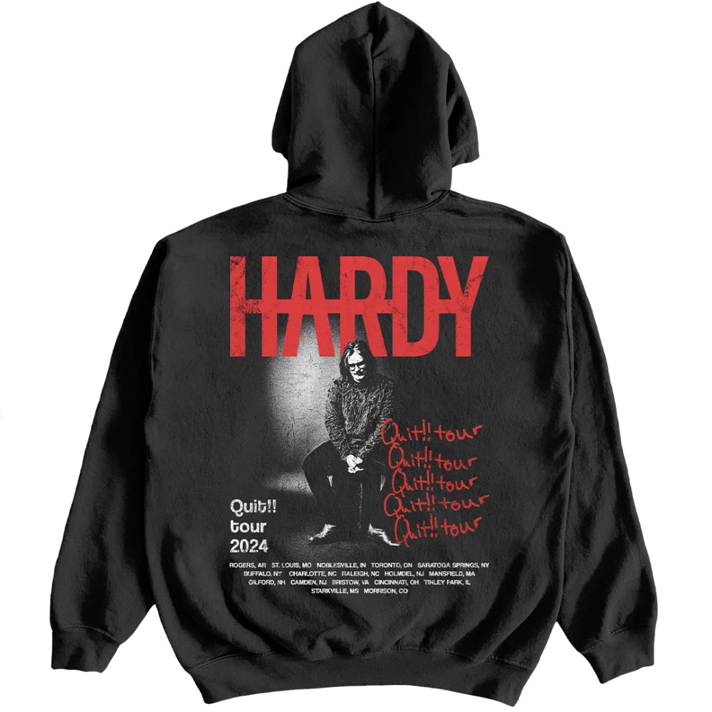 BLACK HOODIE WITH HARDY LOGO ON FRONT. PHOTO & TOUR DATES ON BACK AND QUIT TOUR PRINTED ON THE SLEEVE.
