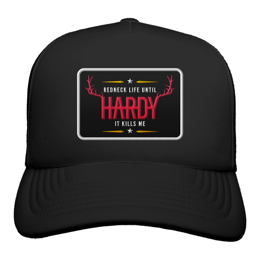Calling all rednecks and friends. this trucker hat featuring a patch with HARDY logo and Redneck Life until it Kills Me. on the front.
